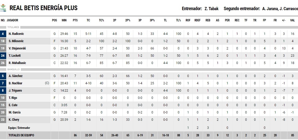 Real Betis Energía Plus: Radicevic (15), Stojanovski (10), Lockett (16), Milosevic (5), Mahalbasic (16) – quinteto titular -, Nachbar (11), Sánchez (7), Triguero (4), Rigo, Cate, García, Chery (2).