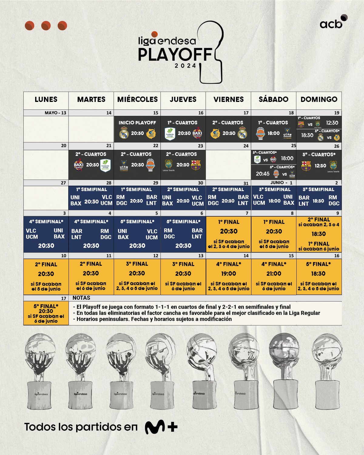 Las hipotéticas semifinales están previstas para dentro de dos semanas, después de la Final Four de la Euroliga, con el FC Barcelona y el Lenovo Tenerife como posibles rivales. Esta ronda, al igual que la final, es al mejor de cinco partidos, los cuales, están fijados para 29 y 31 de mayo, y 2, 4 y 6 de junio; todos a las 20:30 horas, salvo el tercer duelo. Por último, la final comenzaría el 7 de junio (el resto de partidos dependen de cómo acaben las semifinales) y el Real Madrid, si llega, podría enfrentarse a Unicaja, Valencia Basket, UCAM Murcia o Baxi Manresa.