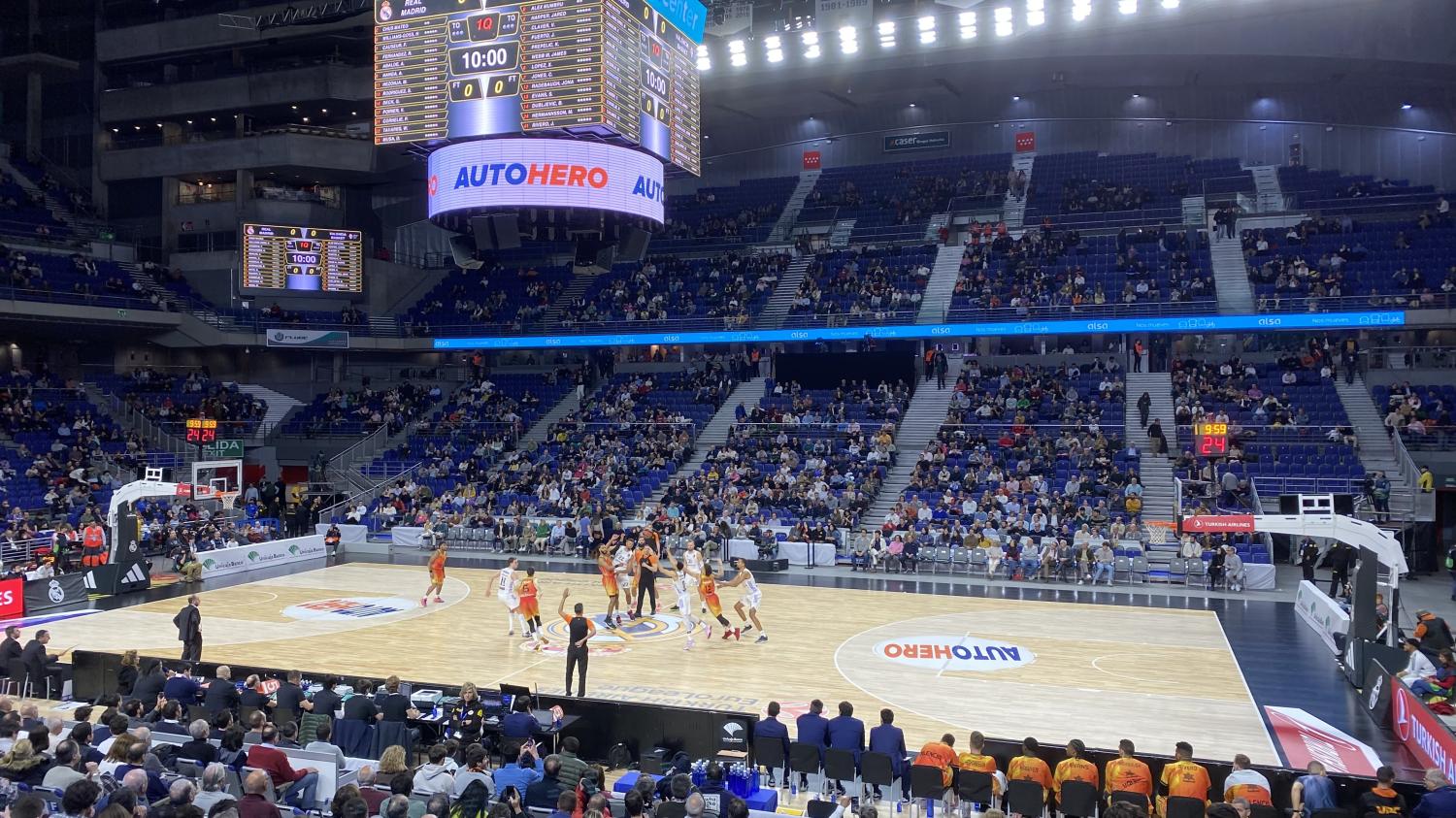 La primera posesión del encuentro terminó con un susto de Adam Hanga, que puso lesionarse tras una mala caída, pero no fue a más, Mientras tanto, Gabriel Deck anotó el primer triple y puso la ventaja blanca en el marcador tras un buen tiro liberado. La calidad blanca se impuso en estos compases, sobre todo con el acierto exterior de Fabien Causeur, al que se le vio muy activo desde la línea del 6'75, aunque en lo general, los locales no pudieron parar estos cinco minutos de completa superioridad. De hecho, el francés llevaba ya 11 puntos con una carta inmaculada, y Chus Mateo comenzó con las rotaciones para que esta intensidad no se redujera. Los madridistas siguieron con la tónica del encuentro de Euroliga, sobre todo del último cuarto, cuando movieron el balín muy rápido y abusaron tanto del triple como de los contraataques, y dieron un clínic. La contienda se volvió mucho más vertiginosa y los visitantes se impusieron, mientras que los jugadores de Óscar Quintana no tuvieron respuesta ante el físico abrumador que expusieron los blancos con Mario Hezonja y Vincent Poirier en cancha.