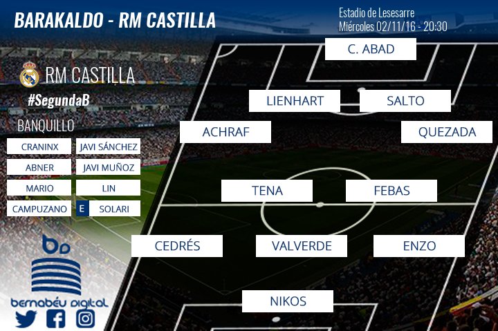 Alineación RM Castilla: Carlos Abad; Achraf, Lienhart, Salto, Quezada; Tena, Febas; Cedrés, Valverde, Enzo; Nikos.