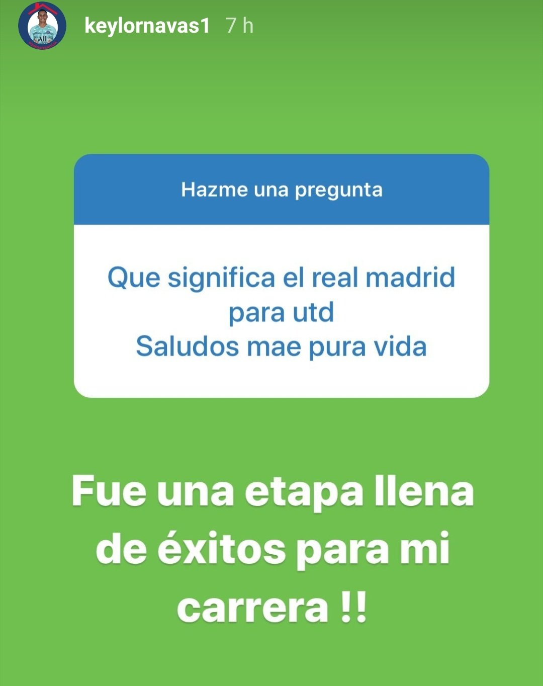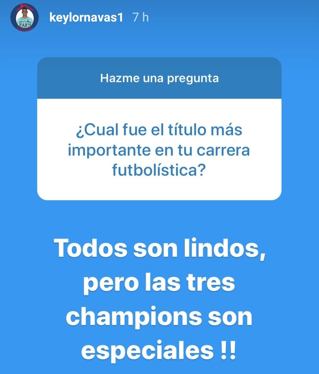Keylor Navas ha respondido a varias preguntas de sus fans quienes le han preguntado a través de Instagram por su etapa en el Real Madrid. "¡Fue una etapa llena de éxitos para mi carrera!", confesó el arquero del Paris Saint-Germain a la pregunta de qué significa el club blanco para él. Sobre el título más importante de carrera futbolística, el portero costarricense reconoció que "todos son lindos", pero que las tres Champions consecutivas que ganó con la entidad merengue "son especiales".