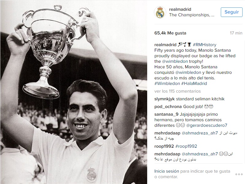 El madridismo va más allá del fútbol y un gran ejemplo de ello es Manolo Santana. Una de las grandes leyendas del tenis español rememora en este día un acotecimiento muy especial y es que hace justo cincuenta años pasó a la historia del deporte de nuestro país al levantar por primera vez el título de campeón de Wimbledon, además, vistiendo la camiseta del Real Madrid.