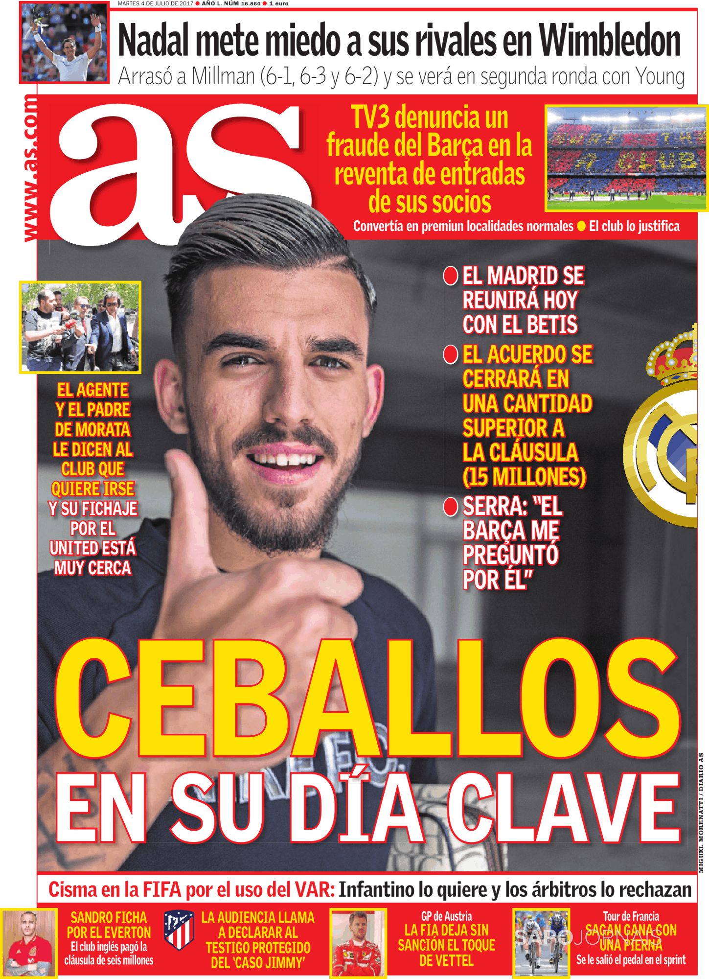 Según informa hoy el diario AS en su portada, el representante y el padre de Álvaro Morata le han comunicado al Real Madrid que el jugador quiere irse del club blanco. Por último, el periódico añade que su fichaje por el Manchester United está cada vez más cerca.