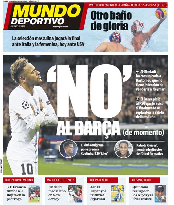 El diario Mundo Deportivo destaca hoy en su portada la negación del presidente del club parisino de vender al brasileño al Barça.