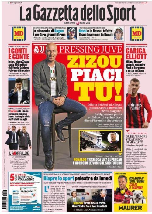 El futuro de Zinedine Zidane es toda una incógnita. En el Real Madrid creen que está más cerca de seguir que de marcharse, pero por si acaso parecen estar tanteando varias opciones como la de Massimiliano Allegri. Hoy, en La Gazzetta dello Sport, desvelan en su portada el sueldazo que estaría dispuesto a pagar el club madridista al entrenador italiano. Al parecer, según el citado diario, el ex de la Juventus firmaría por dos años con opción a un tercero a razón de 10 millones de euros por temporada. Una proposición importante a medio-largo plazo.