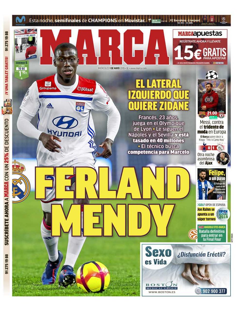 "Durante las últimas semanas se había especulado mucho con posibles candidatos como Junior Firpo (Betis), Alex Grimaldo (Benfica) o David Alaba (Bayern), pero el elegido es Mendy". De nacionalidad francesa, el joven debutó con la selección el pasado mes de noviembre, tiene 23 años y acaba contrato con el Lyon en 2023. Con características muy similares a las de Marcelo, Zidane ya le ha transmitido a Jean Michael Aulas (amigo) su deseo de fichar al lateral, encantado con la idea de vestirse de blanco la próxima temporada. "El técnico parece decidido a que Sergio Reguilón salga cedido la próxima temporada para ganar experiencia", indica, por último, el diario que también destaca que Marcelo seguirá en el club blanco bajo las órdenes de un Zidane que se siente capacitado de recuperar la mejor versión del brasileño.