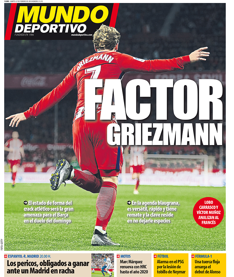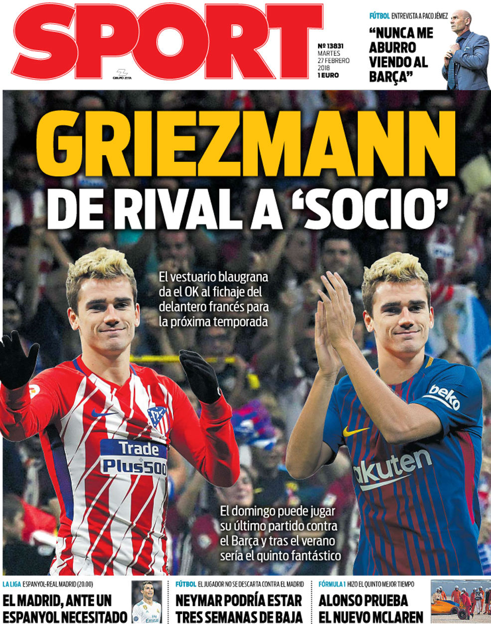 Mundo Deportivo y SPORT sacan a Antoine Griezmann en sus respectivas portadas. El primero se centra más en el partido del domingo, pero el segundo diario desvela que el vestuario blaugrana habría dado el 'OK' al fichaje del delantero francés para la próxima temporada.