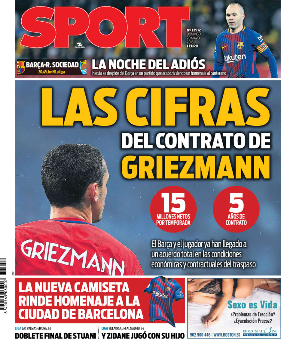 El diario SPORT ha sacado hoy en portada las cifras que cobrará Antoine Griezmann en el Barça si ficha finalmente por el conjunto culé. El francés habría llegado a un acuerdo con el club azulgrana y su contrato sería de 15 millones de euros netos por temporada durante los próximos cinco años.
