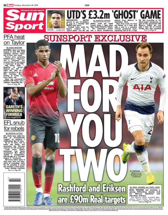 Según informa hoy el diario The Sun en su portada, prepara 101 millones de euros para hacerse con Marcus Rashford y Christian Eriksen. Por el delantero del Manchester United ofrecerían 56,1 millones de euros y 44,9 por el centrocampista danés del Tottenham.