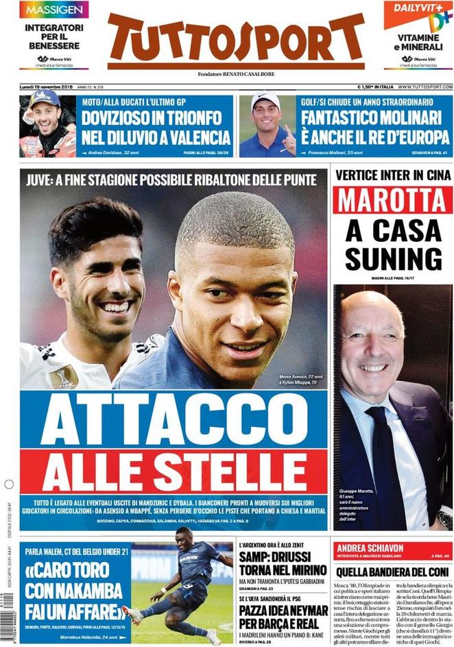 "Ataque a las estrellas" titula hoy el diario Tuttosport en su portada. El periódico italiano desvela la próxima revolución de la Juventus de Turín. Al parecer, la Vecchia Signora baraja vender a Mandzukic y Dybala para hacerse con más fichajes galácticos. Los objetivos de los 'bianconeri' irían desde Marco Asensio a Kylian Mbappé pasando por Chiesa y Martial.