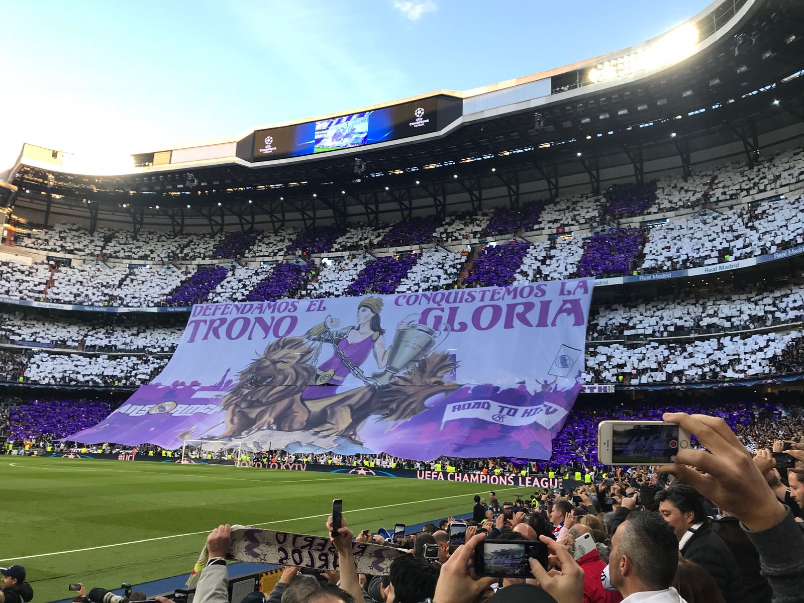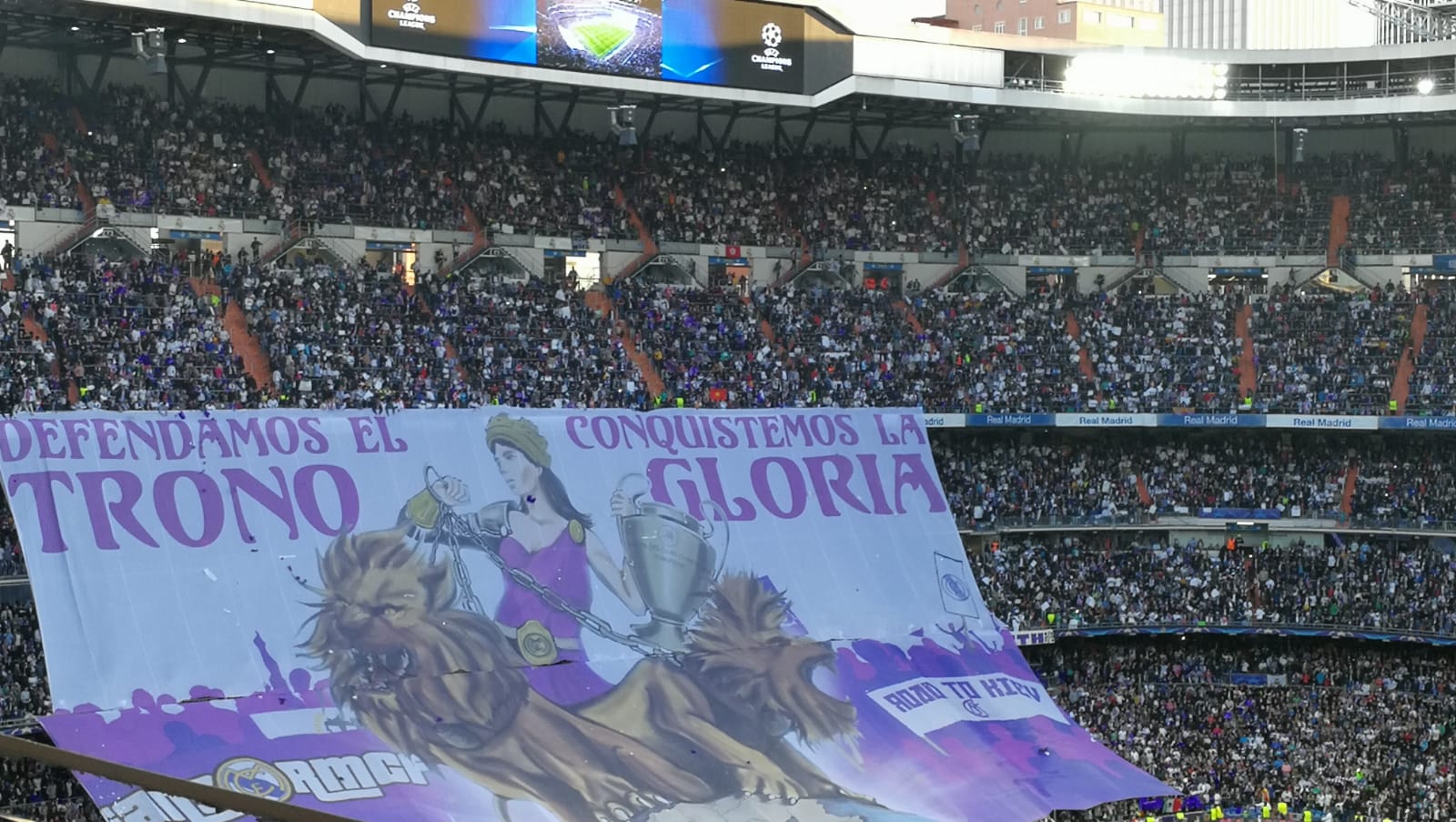 El Santiago Bernabéu mostró dos tifos mientras los jugadores de ambos equipos saltaban al césped. El mítico "Hasta el final, vamos Real" y "Defendamos el trono, conquistemos la gloria". Debajo las fotos:
