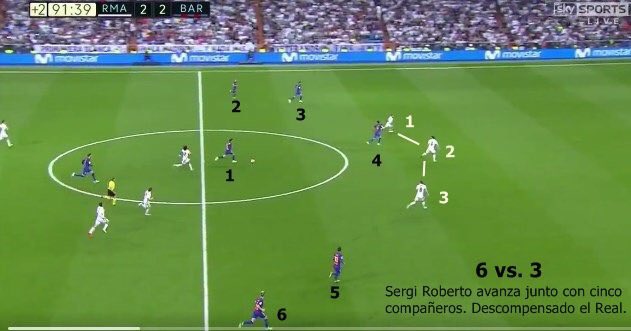 Jose Joaquín Brotons, periodista de Eurosport y tertuliano de El Partidazo de Cope, subió ayer a las redes una imagen donde deja en evidencia la falta de orden y cabeza del Real Madrid en el minuto 92. Mala gestión del equipo, tozudo en conseguir el 3-2 y que acabó facilitando el 2-3 del eterno rival. Como se aprecia en la imagen, Sergi Roberto conduce con hasta 6 jugadores culés en campo rival, mientras que los blancos defienden reculando con 3 defensas. Una jugada que decidió el Clásico y puede valer una Liga.