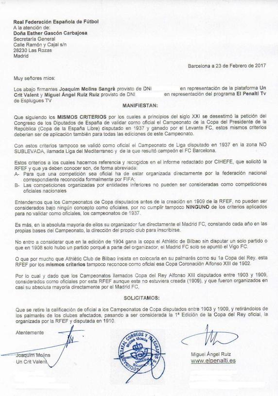Joaquim Molins, de ‘Un Crit Valent’, y Miguel Ángel Ruiz, de ElPenalti.es, han vuelto a la carga para pedir que la RFEF retire cuatro títulos de Copa al Real Madrid, después de que el pasado 23 de febrero firmasen un burofax en el que pedían de manera formal que se anulen las Copas del Rey entre los años 1903 y 1909 debido a que las organizó el club blanco y no la Federación Española. Según informa el diario MundoDeportivo, la RFEF no contestó a la petición y ambos han decidido insistir con la peitición.
