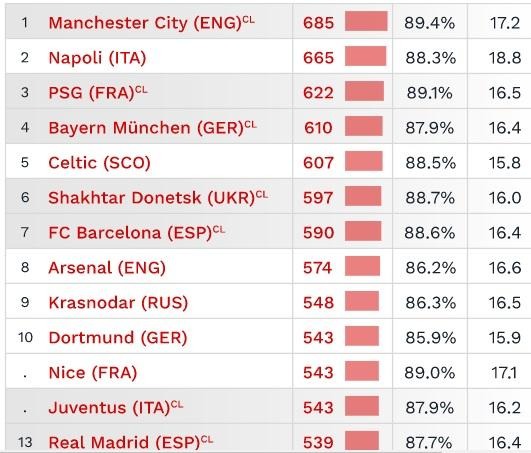 En un informe elaborado por el CIES se muestra la clasificación de los equipos que más pases han completado en lo que llevamos de temporada. Además, también se muestra la velocidad entre pases y pase. Los registros cosechados por el Real Madrid le hacen estar fuera de los diez primeros. Manchester City y Napoli, lideran.