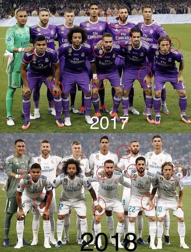 El Real Madrid juega con las supersticiones y casualidad o no, la foto del once inicial fue exactamente igual que la de hace un año en Cardiff. Con un año más, y con el cambio en el pelo o de la cara, pero las posiciones son las mismas.