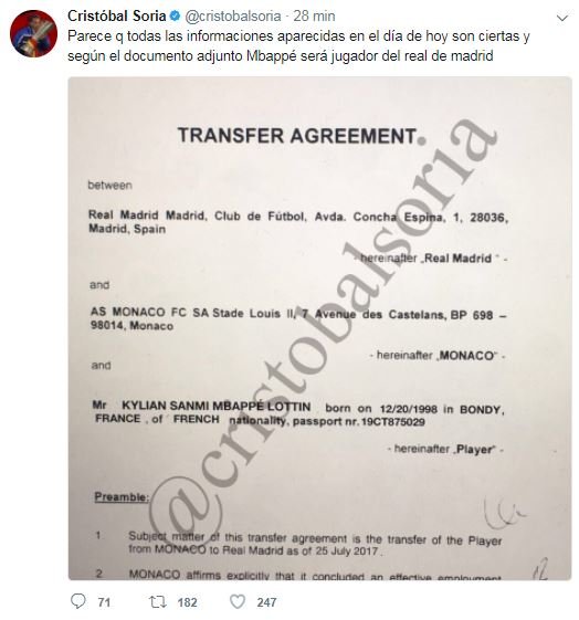 Cristóbal Soria lo ha vuelto a hacer. El tertuliano del Chiringuito de Jugones de la Sexta, nos ha vuelto a deleitar con otro número circense en Twitter. Esta vez se ha encargado de publicar una exclusiva, que luego resultó ser falsa. Soria se quiso colgar la medalla siendo el primero que aportara veracidad en su exclusiva de que Mbappé ya había firmado con el Madrid, adjuntando una foto del contrato en el mismo tweet. Sin embargo, el usuario Muralla Blanca se encargó de demostrar que era un 'fake': era el contrato modificado de James.