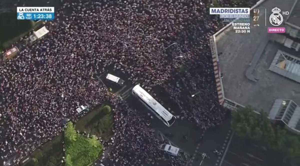 Desde Real Madrid TV, han ofrecido un seguimiento exhaustivo del bus del Real Madrid hasta su llegada al estadio. En las inmedaciones al Santiago Bernabéu, esta era la panorámica de como ha recibido la afición a sus jugadores. ¡ESPECTACULAR!