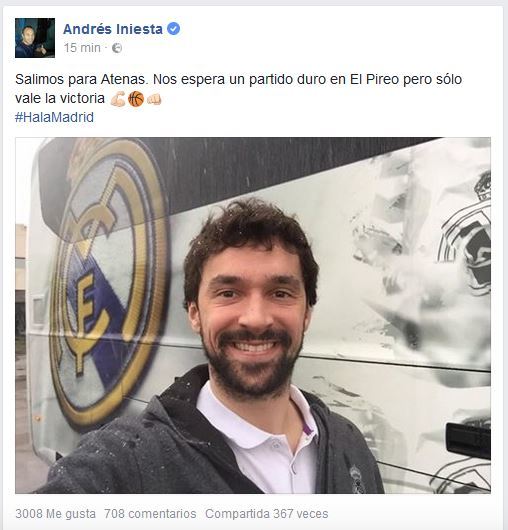 Curiosa la anécdota que protagonizó Andrés Iniesta, jugador del F.C.Barcelona en redes sociales al subir una foto de Sergio Llull acompañada del texto "Salimos para Atenas. Nos espera un partido duro en El Pireo pero sólo vale la victoria. Hala Madrid".