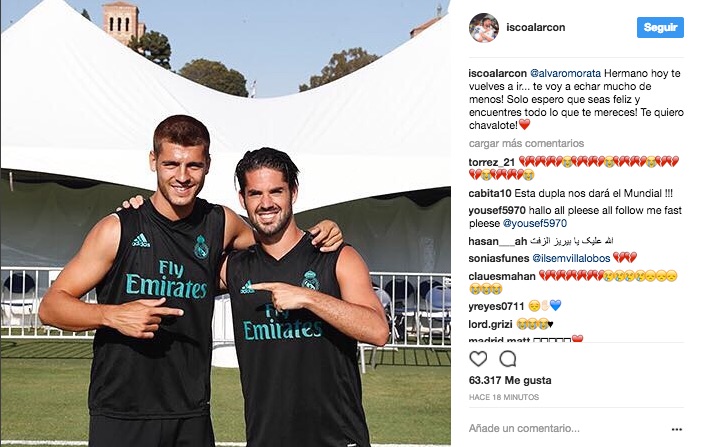 Isco Alarcón, buen amigo del delantero español, ha querido despedirse de su compañero a través de una foto recién subida por el malagueño a Instagram. El malagueño dice esto: "Hermano hoy te vuelves a ir... te voy a echar mucho de menos. Sólo espero que seas feliz y que encuentres todo lo que te mereces. Te quiero chavalote.