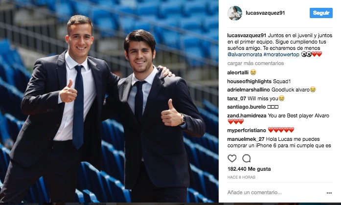 Lucas Vázquez, jugador y amigo con el que ha vivido grandes momentos el bueno de Álvaro Morata así se ha despedido del delantero español: "Juntos en el juvenil y juntos en el primer equipo. Sigue cumpliendo tus sueños amigo. Te echaremos de menos".
