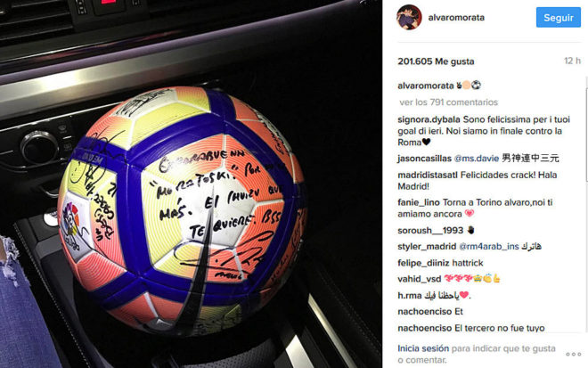 Morata que bromeó en zona mixta con un "antes que se lo den en propia puerta que me lo den a mí" tuvo que esperar hasta conocer el acta del colegiado. Con el acta leída, Morata pidió a sus compañeros que le firmaran el balón del partido, como manda la tradición cuando un jugador marca tres goles. El punta subió el balón firmado por sus compañeros a sus redes sociales.