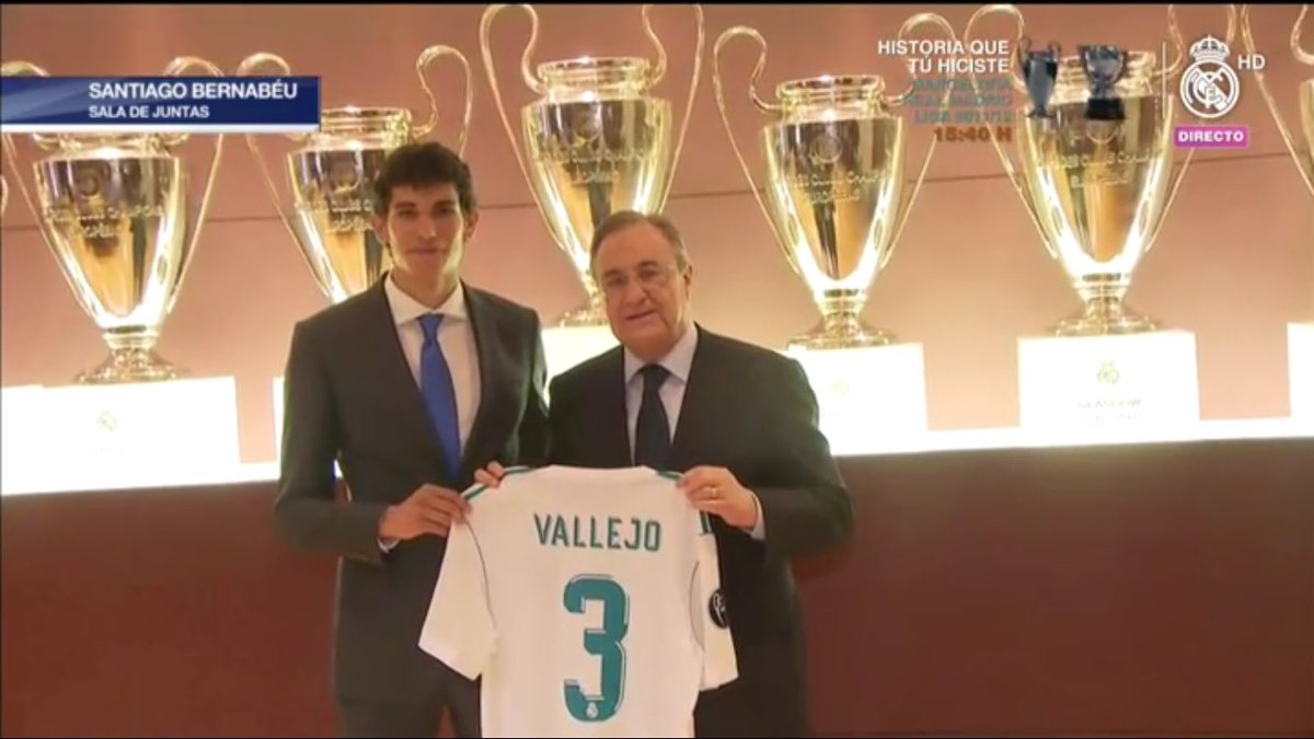 FOTO - Vallejo posando con su nueva camiseta en la sala de trofeos del Madrid