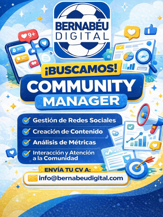 ¡Buenas a todos, madridistas! En Bernabéu Digital estamos en constante progreso para la mejora del contenido, tanto en la web como en todas nuestras redes sociales. Por ello, buscando un Community Manager que se pueda encargar de nuestras cuentas, con publicaciones originales y de calidad. Puedes encontrar todos los requisitos en nuestra imagen justo aquí debajo. Si estás interesado, mándanos tu CV al siguiente correo electrónico: info@bernabeudigital.com