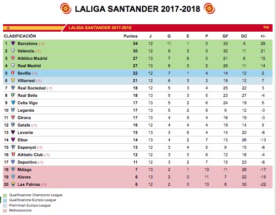 El Atlético de Madrid dormirá en el podium de LaLiga en esta 13ª jornada del campeonato. Y es que con el 0-5 cosechado en el Ciudad de Valencia, los de Simeone tienen ya un balance muy positivo en este sentido. El Atlético ha hecho 21 y ha recibido nada más que seis, es decir que tiene +15 a favor. Por su parte, el Real Madrid, que hasta ayer era tercero, cae a la cuarta plaza. Los blancos han hecho 25 goles y les han hecho 11, con lo que tienen +14 a su favor. Ambos duermen a tres puntos del Valencia, que es segundo y a siete del Barça, que es primero. Curiosamente los dos se miden este domingo en el Camp Nou.