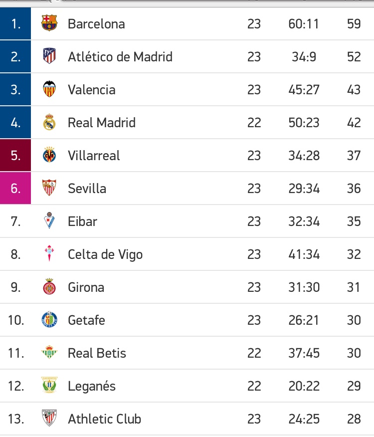Al término de la jornada dominical, la Liga se aprieta en la parte alta. Con el 'frenazo' del F.C.Barcelona, los culés se quedan con 59 puntos en la parte alta de la tabla. Le siguen Atlético con 52 y Valencia con 43 que tras vencer al Levante recupera la senda de la victoria. Cierra la zona Champions, el Real Madrid con 42 puntos. En puestos de Europa League, Villarreal con 37 y Sevilla con 36. En la zona de descenso, Las Palmas con 18, Deportivo con 17 y Málaga con 13.