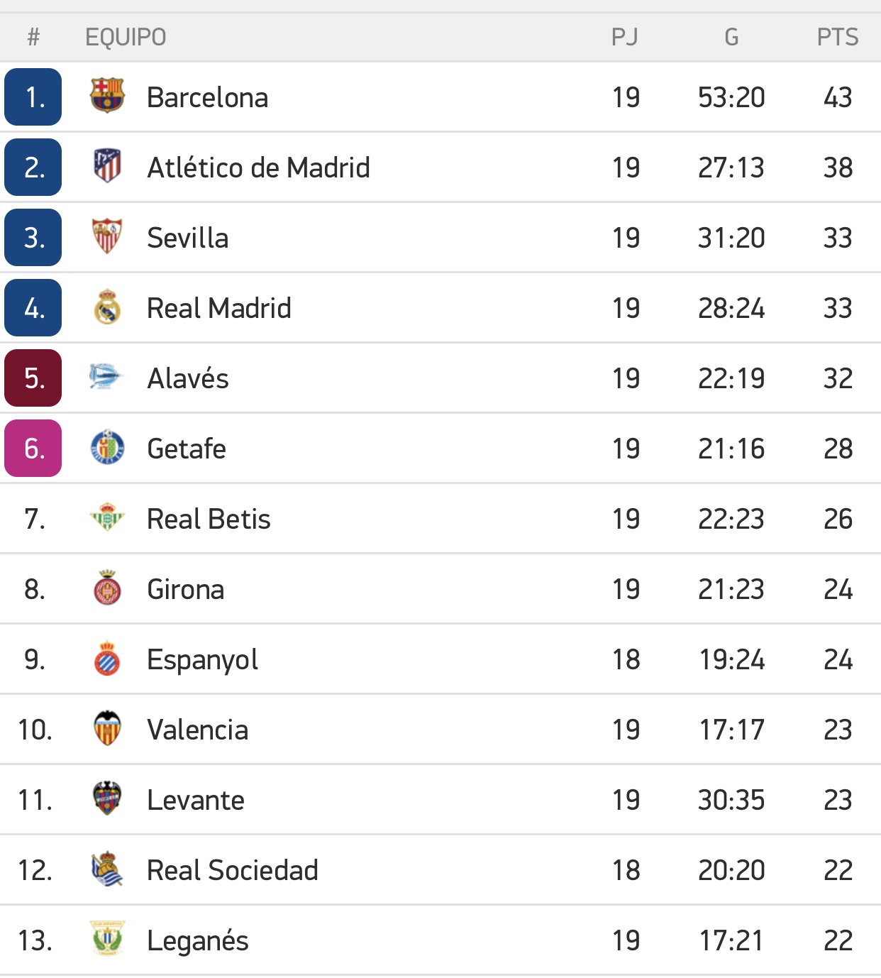 Finaliza la jornada dominical con una victoria importantísima del Real Madrid en el Benito Villamarín (1-2). Tres puntos que sirven a los blancos para llegar hasta los 33 puntos, superar al Alavés (32) en la tabla y colocarse cuarto con los mismos puntos que el tercer clasificado, el Sevilla. Por delante, Atlético con 38 y el Barça, a diez puntos de distancia, es líder en solitario con 43.