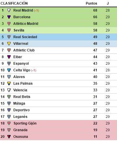 Después de la jornada 29, la clasificación de LaLiga no sufre demasiados cambios más allá de un cambio en la tercera plaza. El Sevilla, que empató en casa contra el Sporting, pierde la plaza de acceso directo a Champions League en detrimento del Atlético de Madrid. Los tres 'grandes' ganaron sus respectivos partidos, por lo que, finalmente, así queda la tabla: