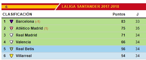 CLASIFICACIÓN - Gameiro sitúa al Atlético a cuatro puntos del Madrid