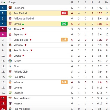 Sigue el Barcelona líder con 13 puntos con un golaverage favorable de +10, mientras que el Madrid también con 13 puntos tiene un goalaverage de +6. Por detrás de los blancos, el Atlético con 11 puntos, precisamente el rival del Madrid el próximo sábado. Cierra la zona Champions, el Sevilla de Machín de manera momentánea con 10 puntos, los mismos que Alavés y Espanyol.