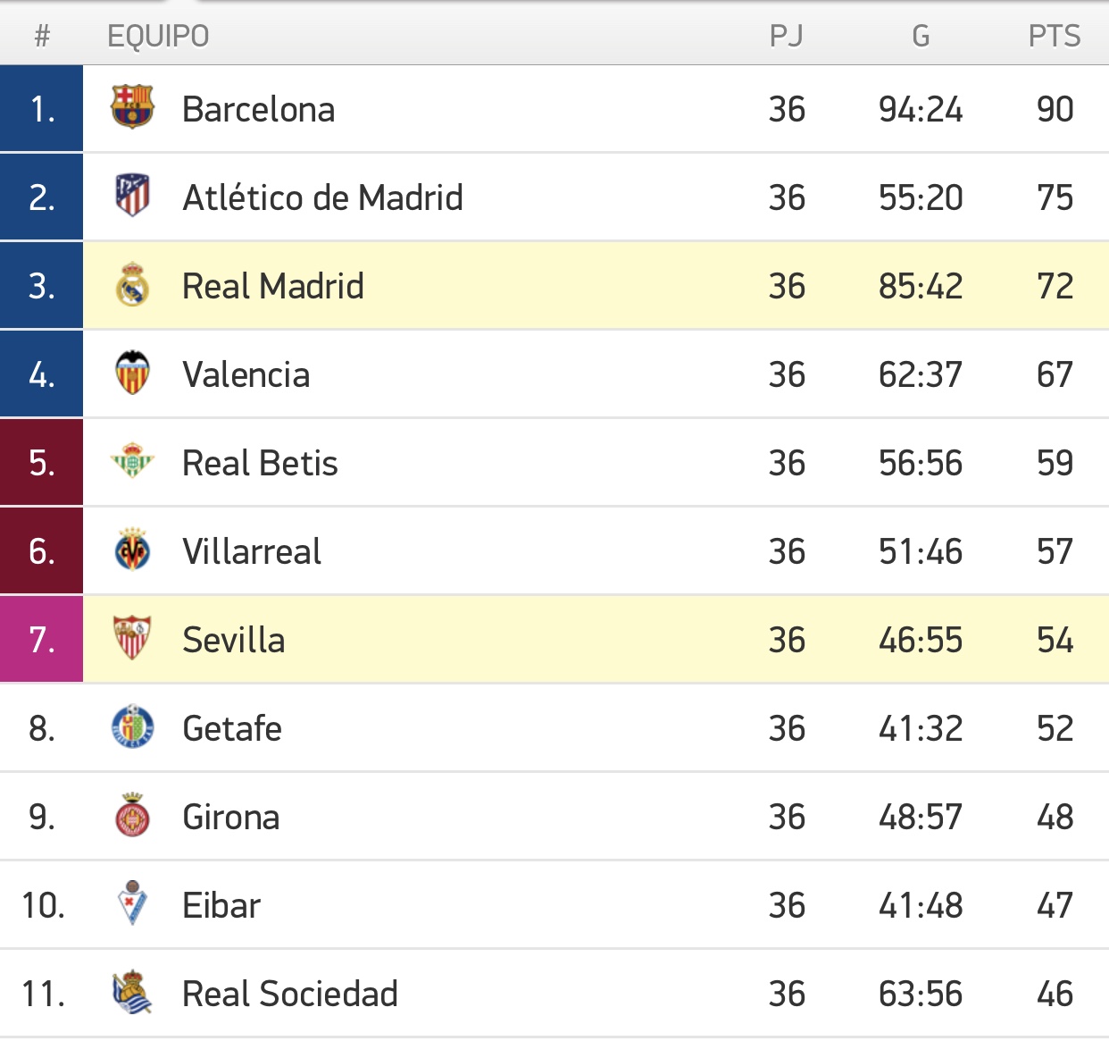 Concluidos los partidos aplazados con motivo de la disputa de la final de Copa, Barcelona 5-1 Villarreal y Sevilla 3-2 Real Madrid, así queda la tabla a falta de dos jornadas para finalizar la temporada en el campeonato doméstico español.