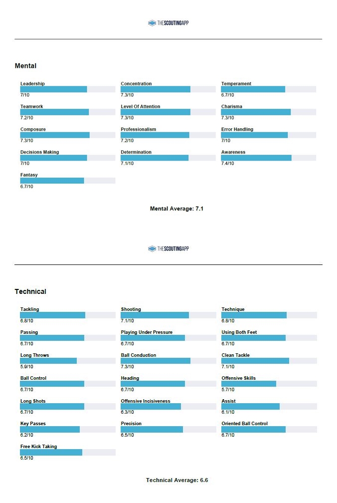 En lo que concierne al aspecto mental, con una media de 7.1/10, destaca gracias a su nivel de atención (7.3/10), su carisma (7.3/10), su conciencia (7.4/10) y sus compostura (7.3/10). Por último, llegamos al apartado técnico con una media de 6.6/10, siendo sus principales puntos fuertes el disparo (7.1/10), sus entradas (7.1/10) y su conducción de balón (7.3/10).