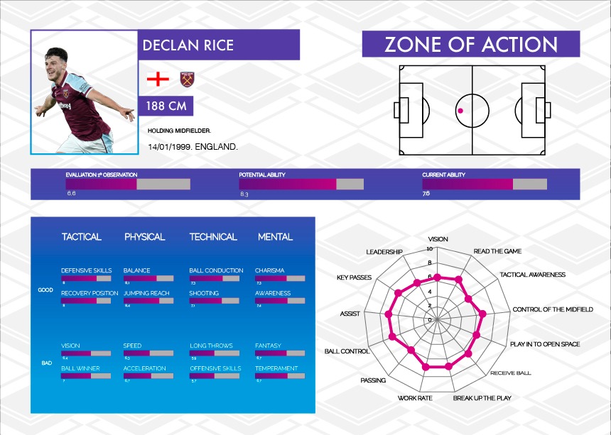 Para empezar, cabe señalar que a Declan Rice se le asigna una habilidad actual de 7.6/10, con un significativo potencial de 8.3/10. En el aspecto táctico presenta una valoración media de 7.4/10, destacando por sus habilidades defensivas (8/10), su conciencia táctica (7.9/10) y su recuperación de posición (8/10). Asimismo, también se le otorga una media de 7.4/10 en el apartado físico, en el que sobresale su ritmo (7.7/10), su equilibrio (8.1/10) y su capacidad de trabajo (7.6/10).