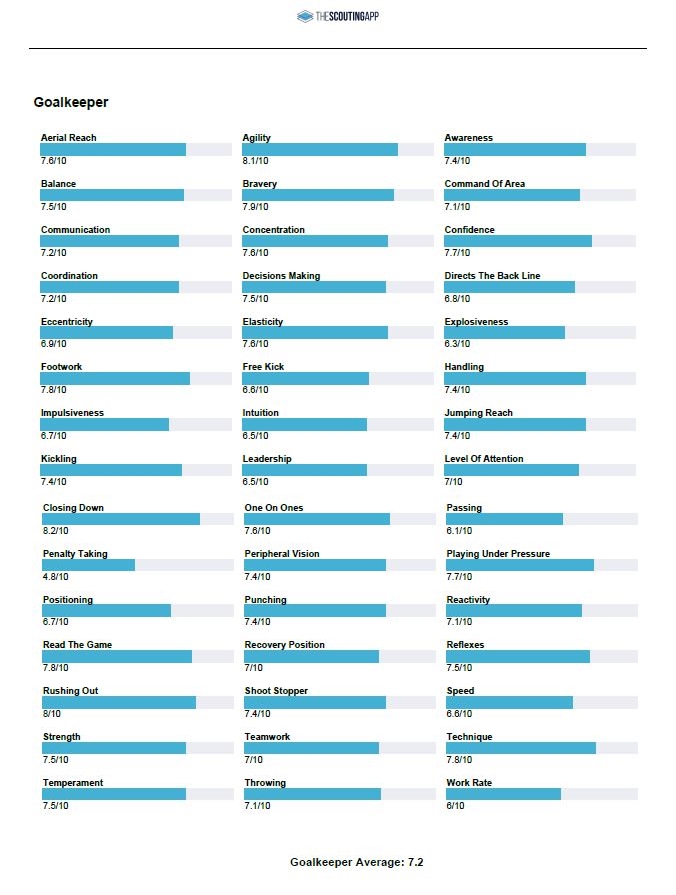 Lo primero que hay que mencionar en su habilidad global actual. El informe le da una valoración de 7.2/10 en estos momentos, pero, conscientes de sus prometedoras cualidades, este dato podría aumentar hasta el 8.4/10. Una nota que nos indica la calidad que tiene en sus manos y en sus botas el meta del Real Madrid.