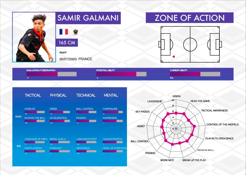 En lo puramente técnico (6.1/10)Samir Galmani llama la atención por sus buenos controles de balón (7/10), el regate (6.5/10) y por sus pases (7.1/10). Para ser lateral derecho es muy completo. Por último, en el aspecto mental cosecha una media de (7.3/10). Destaca por su conciencia en el terreno de juego (8/10), la compostura (7/10) y un alto nivel de atención y concentración (7/10).  No cabe duda de que el francés tiene una proyección tremenda y podría encajar en el perfil de jóvenes talentos que busca el Real Madrid para reforzar una posición que en los últimos años ha arrastrado más problemas que nunca.