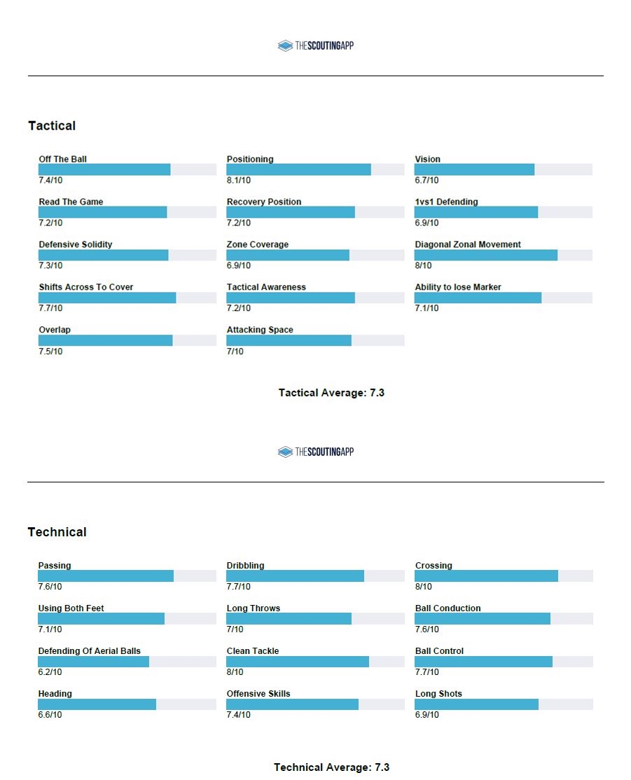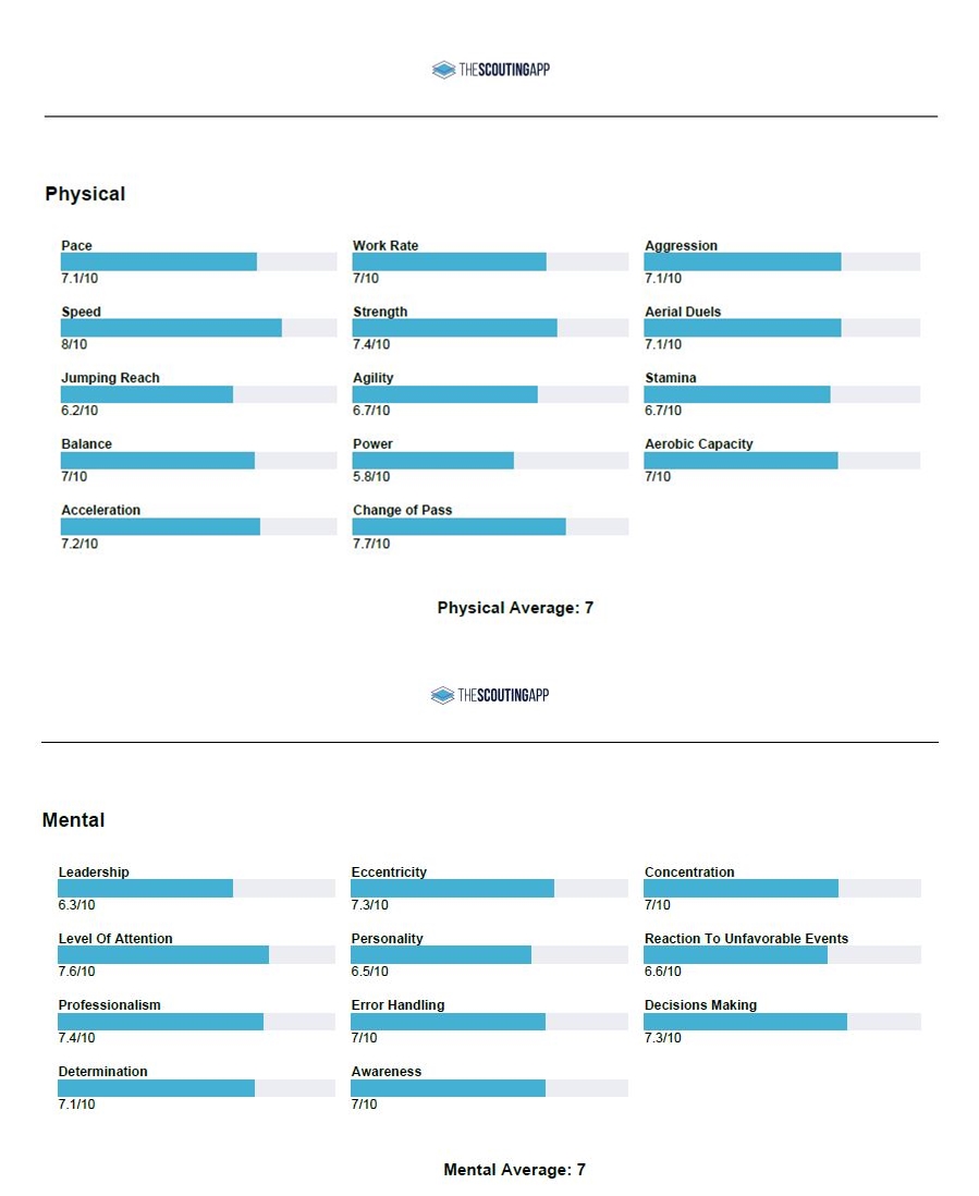 En lo que concierne al aspecto técnico, con una media de 7.3/10, Svava destaca gracias a su habilidad para ir al cruce (8/10), su control de balón (7.7/10) y su habilidad para hacer entradas limpias (8/10). Por último, en el apartado mental, con una media de 7/10, sus principales puntos fuertes son el profesionalismo (7.4/10), su nivel de atención (7.6/10) y su toma de decisiones (7.3/10).