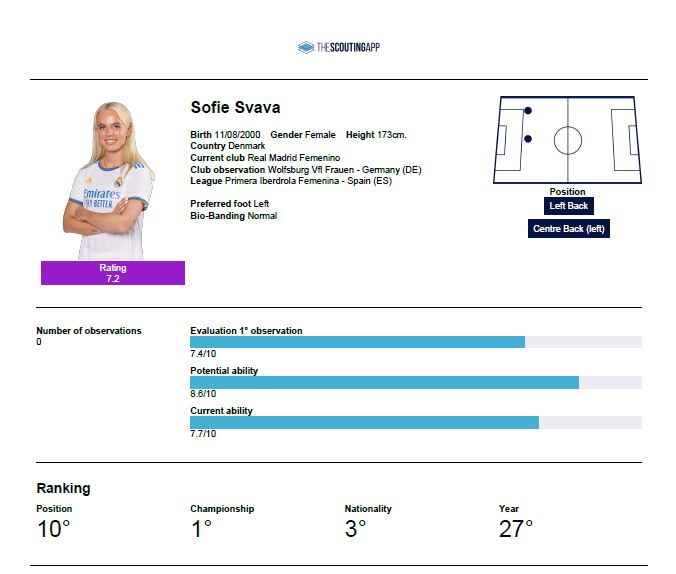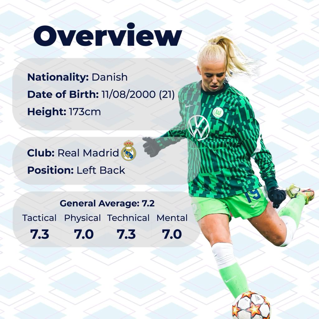 Para empezar, cabe señalar que Svava solo tiene 21 años. Pese a ello, la danesa, que puede jugar de lateral izquierdo o de central, tiene una calidad actual valorada en 7.7/10. No obstante, puede mejorar incluso más con un potencial importante de 8.6/10. En el aspecto táctico presenta una valoración media de 7.3/10, destacando por su posicionamiento (8.1/10) y sus movimientos en diagonal (8/10). Asimismo, también se le otorga una media de 7/10 en el apartado físico, en el que sobresale su velocidad (8/10) y su cambio de ritmo (7.7/10).