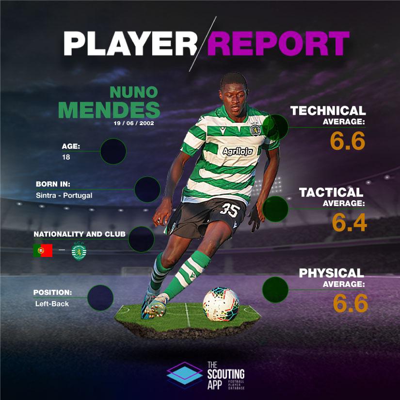 El Real Madrid tantea continuamente el mercado, ojeando a las grandes promesas emergentes del panorama futbolístico internacional. Prueba de ello son los fichajes de Vinicius, Kubo, Odegaard, Rodrygo... Y la última joya en aparecer en el radar blanco es Nuno Mendes. Varios medios han relacionado en las últimas semanas al jovencísimo lateral zurdo portugués con el conjunto madridista, además de con el Liverpool y el Manchester United. El jugador de tan solo 18 años está siendo una de las grandes revelaciones del fútbol luso y lo está bordando en el Sporting de Portugal, donde cuenta con una cláusula de únicamente 45 millones de euros. Pero para conocer más a fondo a este futbolista, The Scouting App, el mejor software de mundo en el ámbito de los ojeadores, ha analizado en exclusiva para Bernabéu Digital a este prometedor carrilero izquierdo, que ya suena como posible sustituto de Marcelo en el Madrid.