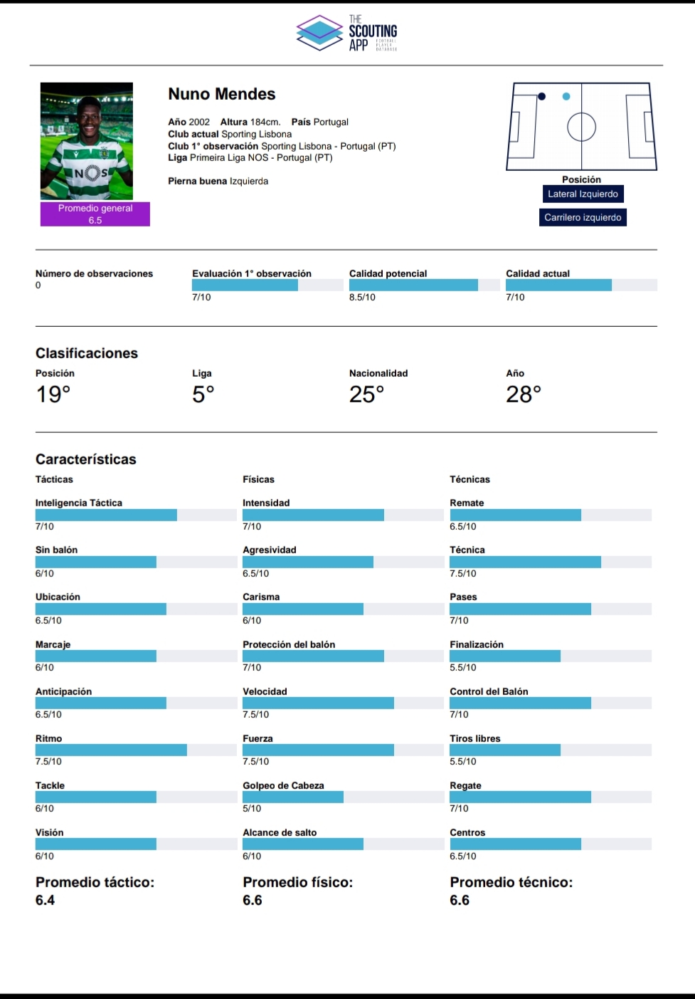 En el informe de TSA se puede apreciar que Nuno Mendes cuenta ya con una valoración importante en cuanto a su calidad actual (7/10) pese a sus solo 18 añitos. Eso sí, apunta maneras. Su potencial es de 8.5 sobre 10, lo que le convierte en uno de los laterales zurdos con mayor proyección del mundo. En el aspecto táctico, este jugador del 2002 y de 1.84 metros de altura destaca por su ritmo (7.5/10) y su inteligencia táctica (7/10) con un promedio de 6.4/10. Asimismo, en cuanto al físico, el joven portugués también despunta por su velocidad (7.5/10), por su fuerza (7.5/10) y su intensidad (7/10) con un promedio físico de 6.6/10. Sin duda un jugador muy potente, pero también con calidad. El luso resalta además por su técnica (7.5/10), sus pases (7/10), su control de balón (7/10) y su regate (7/10), con un promedio técnico de 6.6/10.