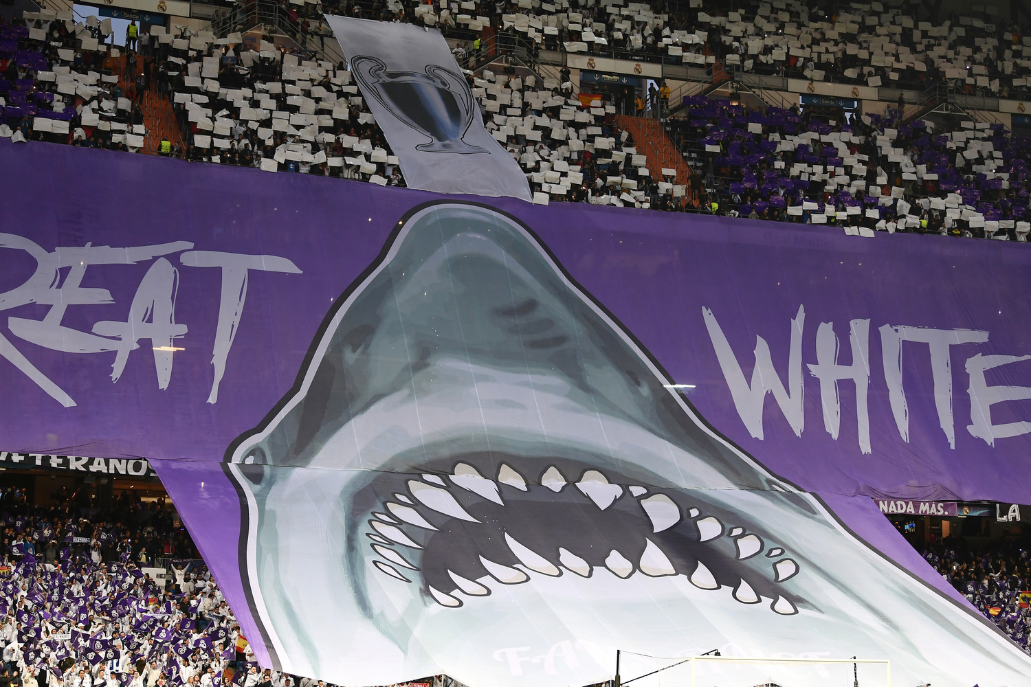 El Santiago Bernabéu volvió a lucir un gran tifo en el fondo sur para recibir a los suyos en los minutos previos al arranque del partido frente a la Juventus. En esta ocasión, el protagonista será un tiburón blanco escoltado por las palabras ‘Great White’, en referencia al gran tiburón blanco. Bernabéu Digital les brinda las mejores imágenes del tifo madridista.