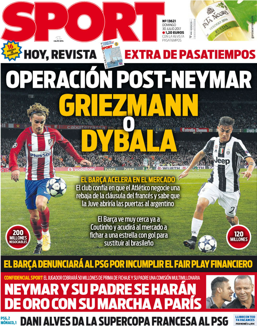 El diario Sport saca en portada los dos mega fichajes que planea el FC Barcelona para sustituir a Neymar, si finalmente se marcha al PSG. Los culés negociarán con el Atlético para rebajar la cláusula de 200 millones de euros de Antoine Griezmann. La otra opción es Paulo Dybala, cuyo fichaje podría permitir la Juventus por al menos 120 'kilos'.
