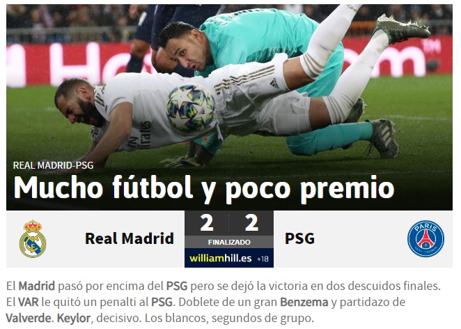 AS también destaca el buen partido de los de Zinedine Zidane ante los parisinos. Benzema fue el autor de los dos goles blancos, mientras que Sarabia y Mbappé fueron los autores de los tantos franceses.