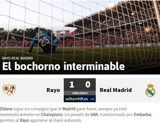 As titula en su página web con "El bochorno interminable" después de una nueva derrota del Real Madrid a domicilio, que ya es la décima en lo que va de liga. El Madrid, sin chispa ni objetivos, está matemáticamente en Champions.
