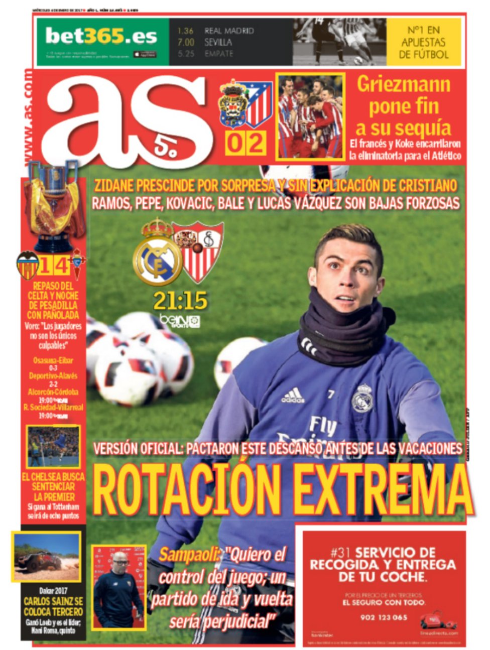 As destaca la baja de Cristiano Ronaldo para el partido que disputará el Real Madrid ante el Sevilla esta noche en el Santiago Bernabéu. Una baja por decisión técnica (oficialmente para otorgar un descanso al jugador portugués) en un panorama complicado por las lesiones. "Zidane prescinde por sorpresa y sin explicación de Cristiano. Ramos, Pepe, Kovacic, Bale y Lucas Vázquez son bajas forzosas. Según la versión oficial el descanso del portugués está pactado desde antes de las vacaciones", apunta el rotativo.