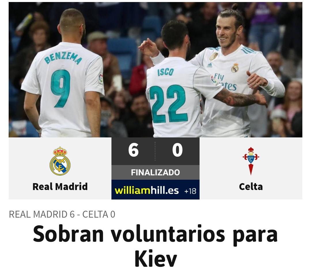 El Real Madrid golea al Celta en el Bernabéu con dos goles de Gareth Bale que quiere participar en Kiev. Isco anotó el tercero. Achraf, Sergio Gómez y Kroos anotaron el resto de los goles.