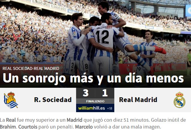 El diario As destaca la superioridad vasca, que jugó con uno más durante 51 minutos. Brahim marcó un golazo que no sirvió para nada, Courtois detuvo un penalti y Marcelo volvió a cuajar un mal partido.