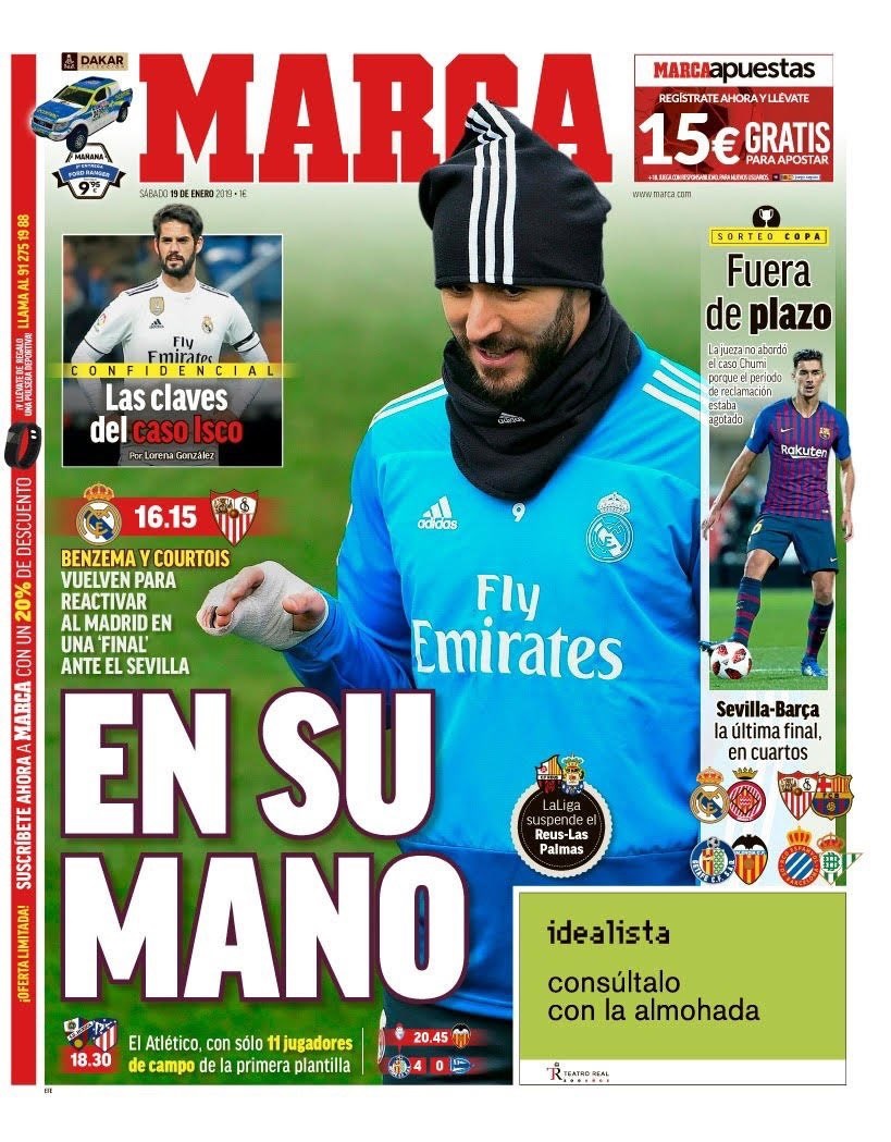 Tras el partido la afición esperaba que se operase y estuviera dos semanas de baja, pero desde el club han optado por un tratamiento conservador. El Diario Marca ha reflejado en su portada la importancia de Benzema en el partido frente al Sevilla, ya que el destino del mismo dependerá, y mucho, de su suerte en el ataque blanco. El francés jugará infiltrado para así soportar el dolor que conlleva jugar con un dedo roto.